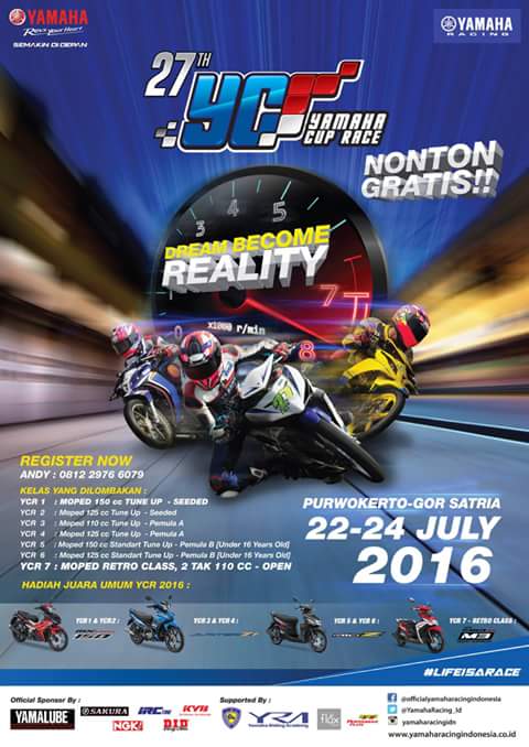 Event legendaris yang sudah berusia puluhan tahun, Yamaha Cup Race [YCR] akhirnya baru muncul di pertengahan tahun 2016 ini. Bila tahun sebelumnya gelaran seri lebih banyak, maka tahun ini hanya akan ada 3 seri saja. Mengawali seri perdana, kota Purwokerto akan didaulat sebagai tempat ajang adu kencang antar pengguna bebek Yamaha. Bertempat di sirkuit non permanen halaman GOR Satria, rutusan pembalap yang didominasi tim pabrikan dan privater nanti akan beradu kencang menjadi yang terdepan. Event sendiri akan digelar selama 3 hari pada Jumat Sabtu dan Minggu atau 22 s/d 24 Juli 2016. YCR punya gengsi tontonan yang cukup tinggi, mengingat biasanya tidak hanya suguhan balap saja yang ditampilkan, namun juga hiburan. Dan seperti tradisi sebelumnya.. ini tetap jadi tontonan GRATIS… cekidot.. Rudi221
