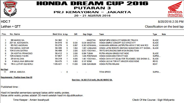 Menginjak seri yang ke 3, Honda Dream Cup [HDC] 2016 kali ini mampir di ibu kota Jakarta. Bertempat di area parkir Pekan Raya Jakarta [PRJ] antusiasme peserta sungguh beda karena pembalap yang datang tak hanya dari wilayah Jawa saja. Nampak beberapa nama datang dari berbagai penjuru, mulai Sumatra Barat, Kalimantan, Bali, hingga Sulawesi. Para pembalap usia belia yang paling banyak datang padati ajang balap satu merk kali ini. Berikut hasil QTT Honda Dream Cup [HDC] seri 3 sirkuit PRJ Kemayoran, Sabtu 20 Agustus 2016. Rudi221