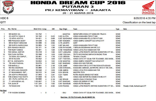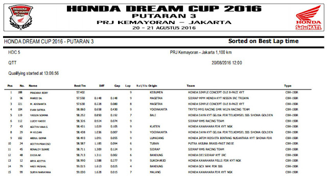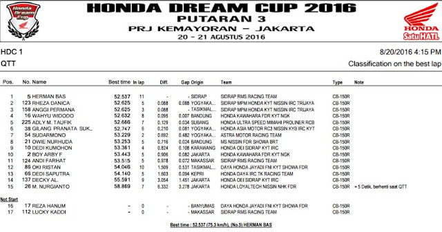 Menginjak seri yang ke 3, Honda Dream Cup [HDC] 2016 kali ini mampir di ibu kota Jakarta. Bertempat di area parkir Pekan Raya Jakarta [PRJ] antusiasme peserta sungguh beda karena pembalap yang datang tak hanya dari wilayah Jawa saja. Nampak beberapa nama datang dari berbagai penjuru, mulai Sumatra Barat, Kalimantan, Bali, hingga Sulawesi. Para pembalap usia belia yang paling banyak datang padati ajang balap satu merk kali ini. Berikut hasil QTT Honda Dream Cup [HDC] seri 3 sirkuit PRJ Kemayoran, Sabtu 20 Agustus 2016. Rudi221