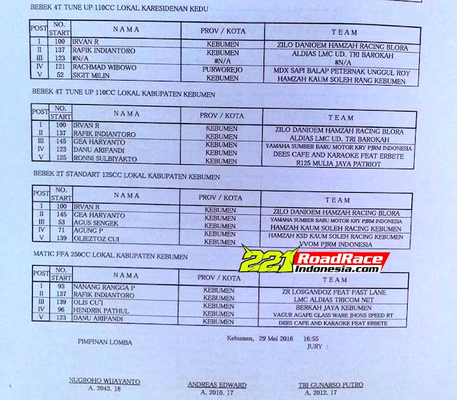 Gelaran tahunan yang mampu sedot 327 starter dari 194 peserta ini memiliki warna tersendiri dengan hadirnya simungil Puput Cribo. Sebenarnya tak hanya Puput pebalap cilik yang turut serta ramaikan road race Kebumen, namun ada beberapa pembalap cilik laki-laki lainnya yang juga unjuk gigi, namun turun di kelas yang lebih sederhana yakni mini poket bike. Gelaran ini juga sukses jadi magnet kuat bagi para pembalap luar provinsi seperti Jawa Barat dan juga Jawa Timur. Berikut hasil lengkap Bupati Kebumen Road Race 2016 Sirkuit Alun-alun Kebumen.Rudi221
