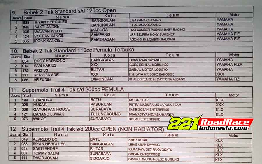 Tak kurang dari 247 starter dari 126 peserta, turun di kejuaraan road race yang baru pertama kali digelar di kota yang sedang memprihatinkan soal lumpur Lapindo-nya ini. Sontak gelaran ini sukses manjakan ribuan pasang mata khususnya para warga sekitar yang jarang-jarang melihat aksi kuda besi beradu cepat di tikungan. Terciptanya sirkuit dadakan ini adalah akibat terputusnya jalan tol yang menghubungkan Gempol – Porong akibat luapan lumpur beberapa tahun lalu, sehingga mudah menyulap jalan tol jadi sirkuit balap motor. Pembalap yang hadir tak hanya dari wilayah Jatim, namun beberapa juga datang dari Kalimantan dan Sulawesi. Berikut hasil lengkap “Bupati Cup FDR Honda Super Moto Road Race Challenge 2016” Sirkuit Jabon EX. Tol Sidoarjo, Minggu 21 Februari 2016. Cekidot.. Rudi221