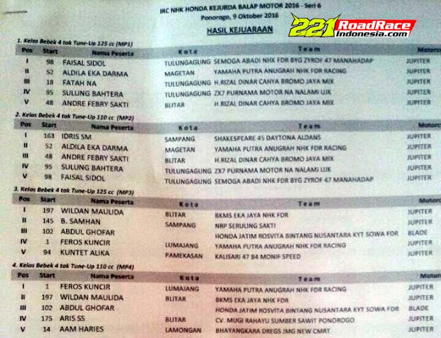 Berikut hasil lengklap IRC NHK HONDA KEJURDA BALAP MOTOR 2016 Seri 6 FINAL Sirkuit Alun-alun Kota Ponorogo, Minggu 9 Oktober 2016. Cekidot.. Rudi221