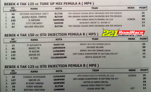 Pembenahan juga tak hanya pada sistem secara teknis saja, namun lintasan kali ini berbeda dari pada seri sebelumnya maupun tahun sebelumnya, Yup… tradisi trek lambat dengan model tikungan mati tidak berlaku di seri 2 ini. Sirkuit dominan berkarakter tikungan-tikungan cepat rolling speed. Tontonan Kejurda pun lebih berkelas dari biasanya yang lebih dominan gunakan sirkuit jalan raya. Pada balapan kali ini, sukses jaring petarung tikungan sejumlah 180 pembalap dari 265 starter. Berikut hasil lengkap BUPATI CUP KEJURDA BALAP MOTOR JAWA TIMUR Seri 2 Minggu 2 April 2017 Sirkuit GOR Lembu Peteng Tulungagung.. Cekidot… Rudi221