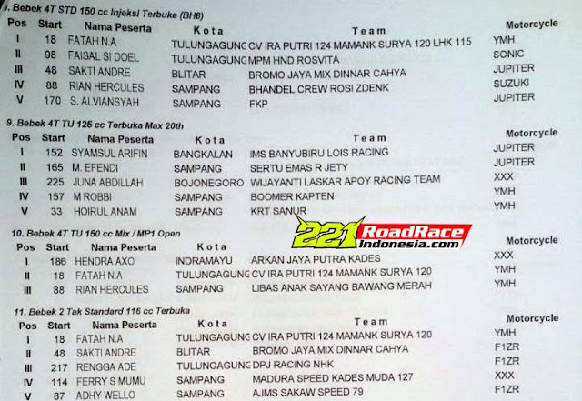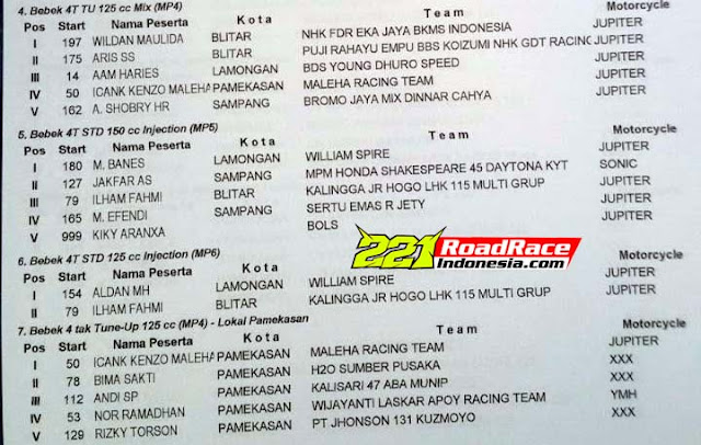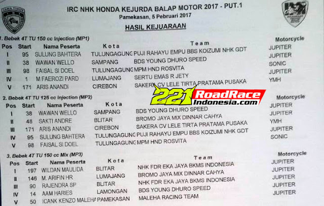 Berikut Hasil lengkap IRC NHK HONDA KEJURDA BALAP MOTOR 2017 Seri 1 Sirkuit Jl. Joko Tole Asem Manis kota Pamekasan Madura, Minggu 5 Februari 2017. Cekidot… karo ngopi Guys…. Rudi221