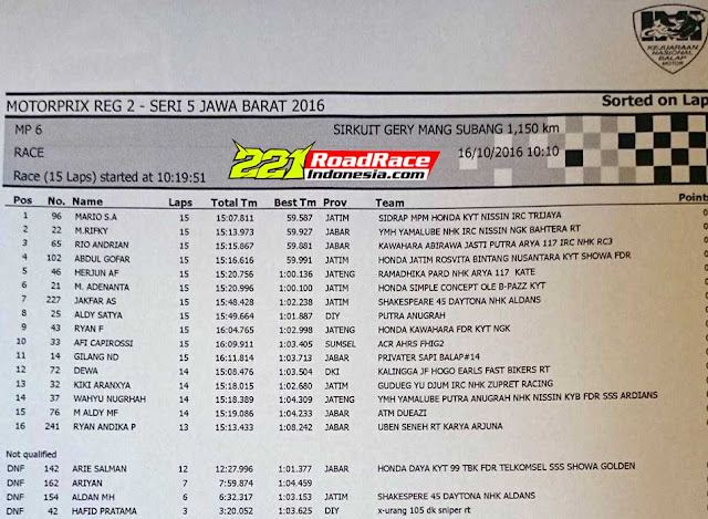 Berikut hasil lengkap kelas MP6 Kejurnas Motoprix Region II Jawa seri 5 Sirkuit Gery Mang Subang Jawa Barat, Minggu 16 Oktober 2016. Cekidot. Rudi221