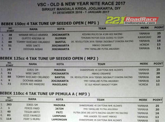 Berikut hasil lengkap 20 kelas di VSC – OLD & NEW YEAR NITE RACE 2017 Sirkuit Mandala Krida Yogyakarta, 31 Desember 2016 sampai 1 Januari 2017 atau Sabtu malam Minggu, cekidot.. Rudi221