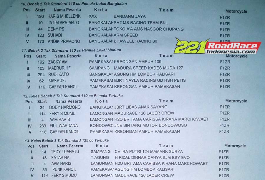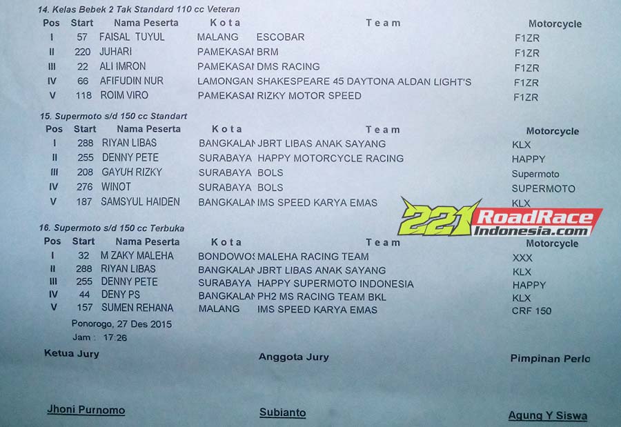 Suguhan kompetisi sangat menghibur. Rider-rider papan atas JATIM Sukses menghibur ribuan pasang mata penonton di pulau garam itu. Nama-nama besar seperti Sulung Giwa, Faisal Sidoel, Bima SN, Feros Kuncir dan Idris SM Cukup kuat dominasi pertarungan panas di event perdana kali ini. Berikut hasil lengkapnya.Rudi221
