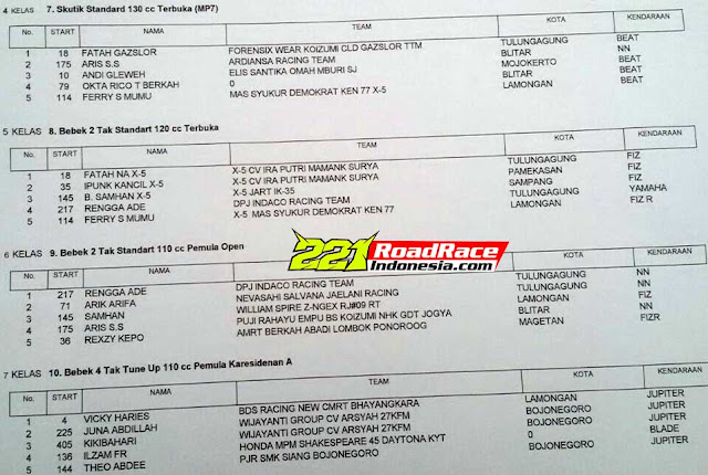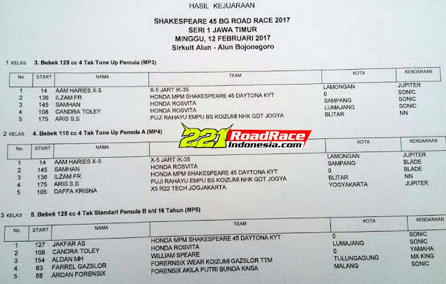 Berikut hasil lengkap SHAKESPEARE 45 BG ROAD RACE 2017 Seri 1 Sirkuit Alun-alun Kota Bojonegoro, Minggu 12 Februari 2017… Cek.. cek.. cekidot..!! Rudi221