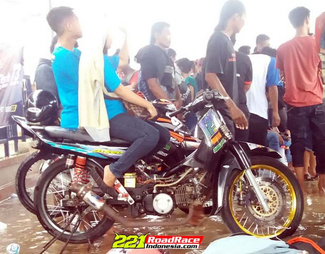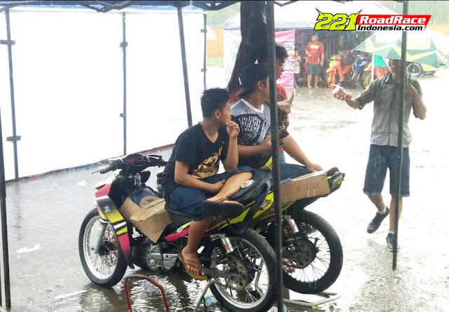 Hujan lebat membuat kondisi trek aspal alun-alun Ponorogo tak hanya basah melainkan sudah seperti sungai, sehingga bebek-bebek kencang seperti berenang menerjang genangan air. Tak hanya di lintasan, di paddock juga lumayan banjir.