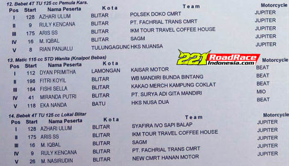 Imbasnya pun ada pada peserta yang tergolong sangat sedikit yakni hanya 69 peserta dari total 184 startter. Sayangnya hampir 70% peserta disumbang dari kelas bebek 2 tak dan Matic yang sejatinya adalah kelas pendukung. Bagaimana dengan kelas unggulan Bebek 4 Tak MP1-MP2 [seeded], MP3-MP4 [pemula A], dan MP5-MP6 [pemula B]..? sepi coy.. kelas seeded MP1 MP2 nihil.. tercatat hanya MP4 dan MP5 kelas yang nampak tarung. Selebihnya adalah kelas4 Tak lokalan.
