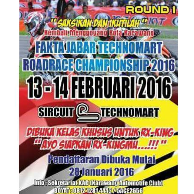 Masih hangat kita pijaki tahun 2016, namun penggiat aktifitas olah raga otomotif Jawa Barat nampaknya sudah siapkan agenda adu pentir gas untuk beberapa daerah. Dan salah satunya adalah Kabupaten yang sangat tersohor dengan goyangannya “Karawang” siap gelar event road race di pertengahan Februari 2016 nanti. Event bertajub “FAKTA JABAR TECHNOMART ROAD RACE CHAMPIONSHIP 2016” siap digelar Sabtu & Minggu 13-14 Februari 2016 di lokasi langganan yakni Sirkuit Technomart Karawang.