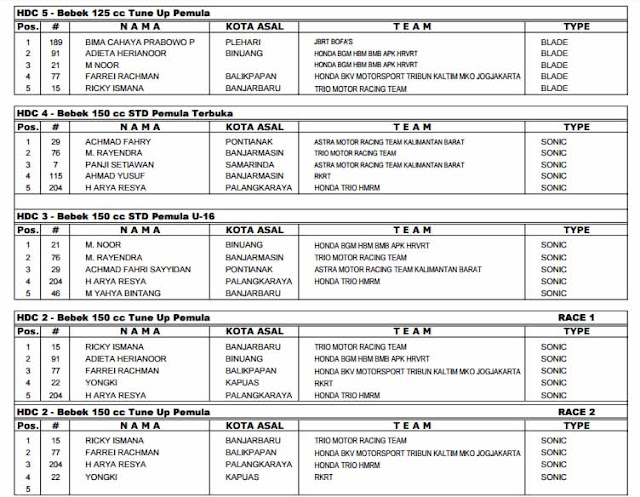 Berikut hasil keseluruhan kelas di HONDA DREAM CUP 2017 Sirkuit Lapangan Murjani kota Banjarbaru Kalimantan Selatan Sabtu – Minggu 13-14 Mei 2017