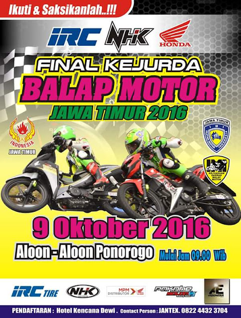 Kota reog gasss.. polll.. mentog….!!! Bumi Reog Ponorogo kali ini akan didaulat sebagai kota untuk menggelar seri pamungkas kejurda balap motor 2016 wilayah Jawa Timur. Setelah meengagendakan opsi sebelumnya di beberapa kota, akhirnya Ponorogo lah yang terpilih jadi persinggahan tempat bertarung para rider terbaik Jawa Timur nantinya.  Agenda Kejurda Balap Motor seri final 2016 ini nanti akan berlangsung di sirkuit tengah-tengah kota tepatnya di alun-alun Ponorogo pada Minggu 9 Oktober 2016. So.. siapkan kuda besi terkencang kalian guys… 😉 Rudi221