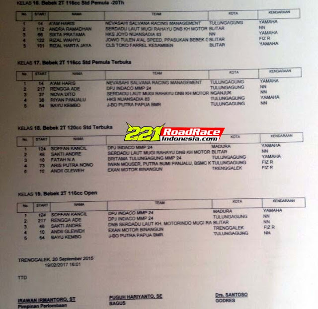 Terlepas dari event yang awal status jadi tidaknya penuh ragu dan bimbang. event tetap berjalan maju meski beberapa race di tengah hujan lebat dengan diwarnai banyak insiden crash. Berikut beberapa dokumentasi dan hasil lomba yang kami dapat daro NETRALINDO WLINGI ROAD RACE OPEN 2017 Blitar.. Cekidot.. Rudi221