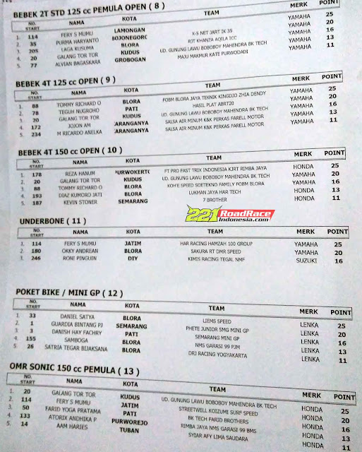 Untung para rider JATENG tetep kokoh pendirian untuk tidak mau bertekuk lutut pada permainan agressif Jawa Timuran. Alhasil podium-podium utama tetap JATENG yang pegang. Kecuali kelas bergengsi 2 Tak open JATIM yang juara. Kalau itu sih wajar, mengingat F1ZR-F1ZR JATIM terkhusus Madura larinya memang susah dibntuti.