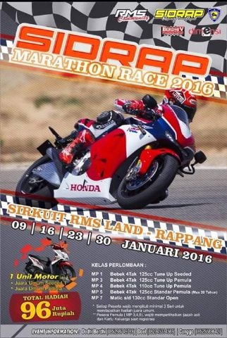 Dan mengawali jadwal balap 2016, kali ini RMS Land yang notabene adalah sirkuit road race murni khusus bebek, menggelar hajatan bertajub “SIDRAP MARATHON RACE 2016” yang dijawalkan mulai tanggal 9 Januari, 16 Januari, 23 Januari dan 30 Januari 2016 di sirkuit RMS Land Rappang. Adapun kelas yang dilombakan adalah sebagai berikut: